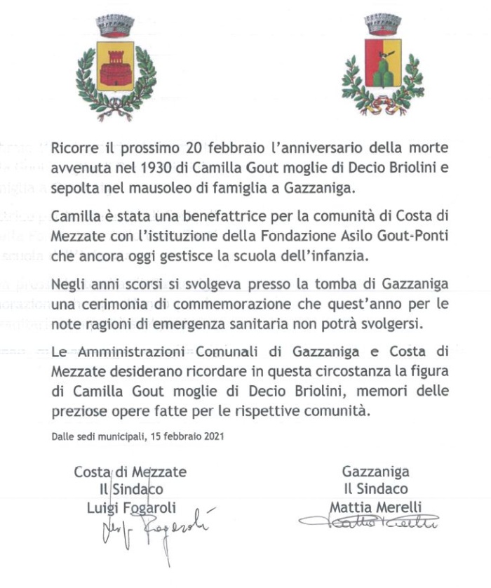 Nota congiunta dei comuni di Costa di Mezzate e Gazzaniga per l'anniversario della morte della Nobildonna Camilla Gout Ponti.