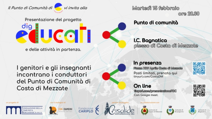 Martedì 15 febbraio 2022, ore 20:30, incontro tra i conduttori del progetto Digeducati presso il Punto di Comunità di Costa di Mezzate, sito in Piazza XXV aprile.