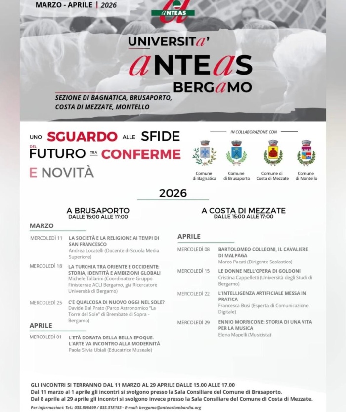 Anche quest’anno ANTEAS (Associazione Nazionale Tutte le Età Attive per la Solidarietà) insieme ai comuni di Costa di Mezzate, Bagnatica, Brusaporto e Montello propone una serie di incontri per l’aggiornamento culturale per contribuire all’affermazione della cultura e alla diffusione di valori, di memorie, di esperienze di vita preziosi per la comunità.