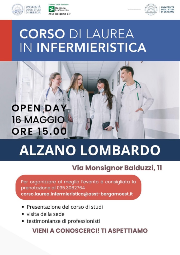 L'open day del corso di laurea in infermieristica si terrà giovedì 16 maggio 2024, ore 15:00, presso la sede di Alzano Lombardo in via Balduzzi, n. 11.