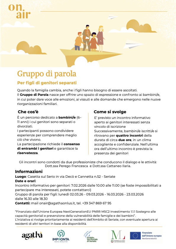 Sabato 7 febbraio 2026, dalle 10:00 alle 11:00, si terrà l'incontro di preserntazione del progetto "On Air", gruppo di parola per figli di genitori separati.