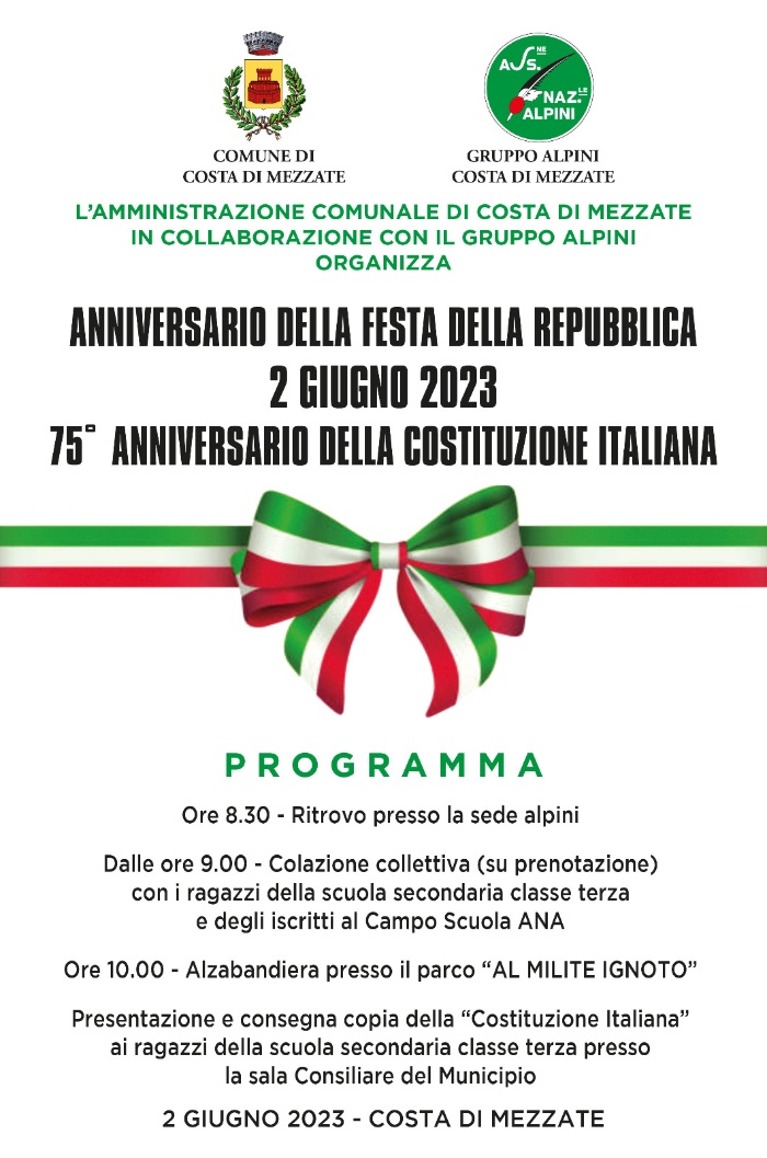 In occasione dell'anniversario della Festa della Repubblica, l'Amministrazione comunale organizza un momento di celebrazione nella mattinata di venerdì 2 giungo 2023.