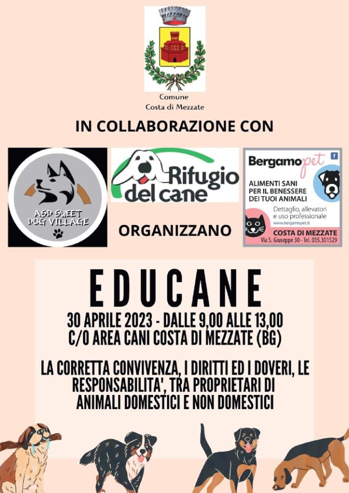 Il corso si terrà domenica 30 aprile, dalle ore 09:00 alle ore 13:00, presso l'area cani di Costa di Mezzate.