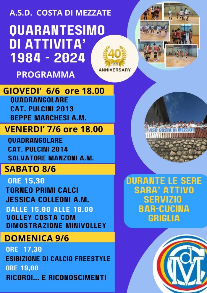 L'Associazione Sportiva Dilettantistica (ASD) di Costa di Mezzate festeggia i suoi quarant'anni con quattro giorni di festa dello sport, da giovedì 6 giugno a domenica 9 giugno presso il centro sportivo.