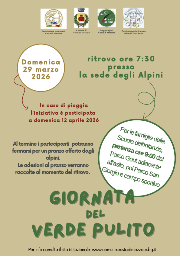 Domenica 29 marzo 2026 torna l'annuale giornata del Verde Pulito, iniziativa volta alla pulizia del territorio dai rifiuti abbandonati. Ritrovo fissato per le ore 07:30 presso la sede degli alpini.