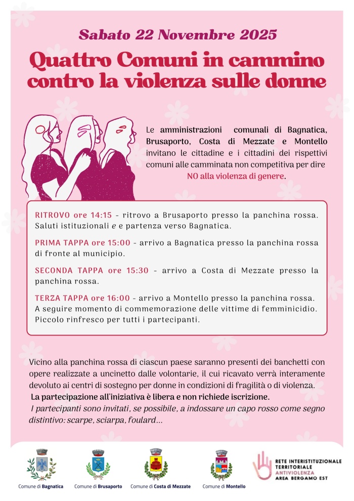 Sabato 22 novembre 2025 si terrà la tradizionale “Camminata dei quattro comuni” contro la violenza di genere, organizzata insieme ai comuni di Bagnatica, Brusaporto e Montello: