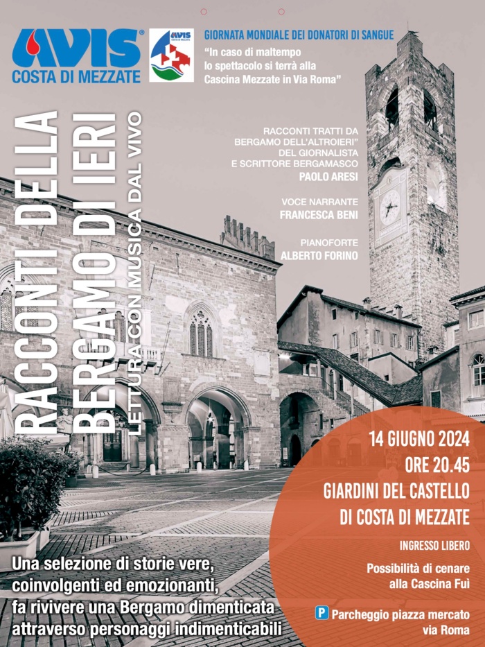 "Racconti della Bergamo di ieri" è una serata organizzata dalla locale sezione AVIS con il patrocinio dell'Amministrazione comunale, approvato con Delibera di Giunta comunale n. 53 del 22/05/2024
