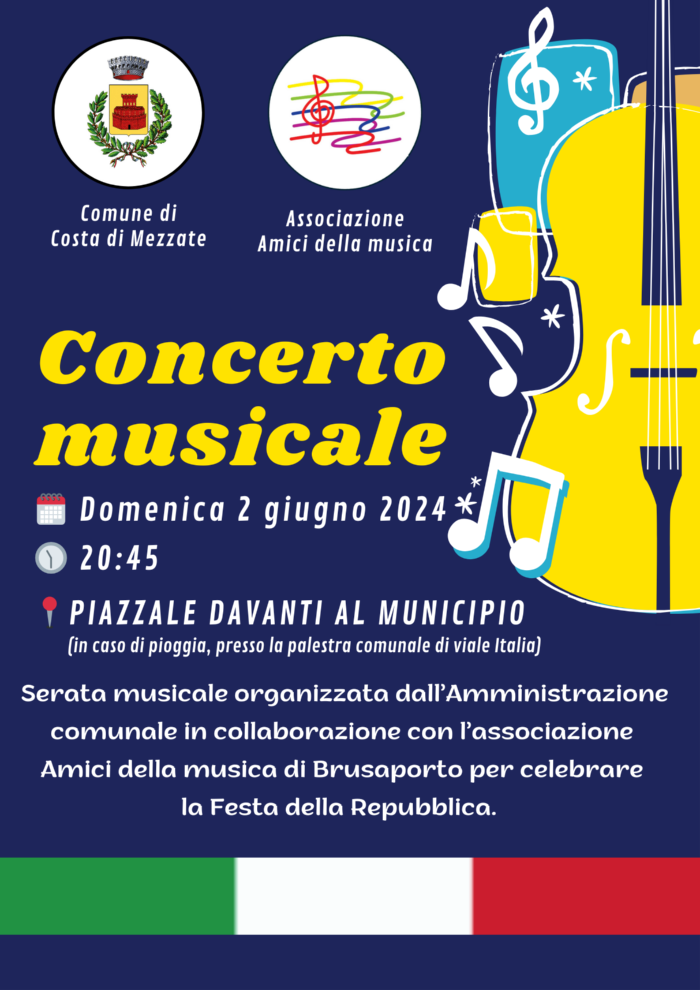 Descrizione In occasione delle celebrazioni per la Festa della Repubblica, l'Amministrazione comunale organizza una serata musicale in collaborazione con l'Associazione Amici della Musica di Brusaporto. Domenica 2 giugno 2024ore 20:45piazzale davanti al Municipio (in caso di pioggia, l'evento si terrà presso la palestra comunale). Concerto musicale domenica 2 giugno 2024.