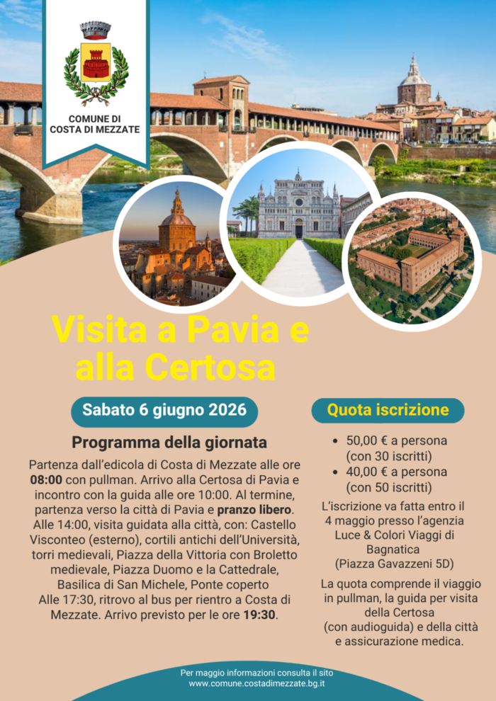L'Amministrazione comunale organizza per sabato 6 giugno 2026 una visita culturale alla città di Pavia e alla Certosa.