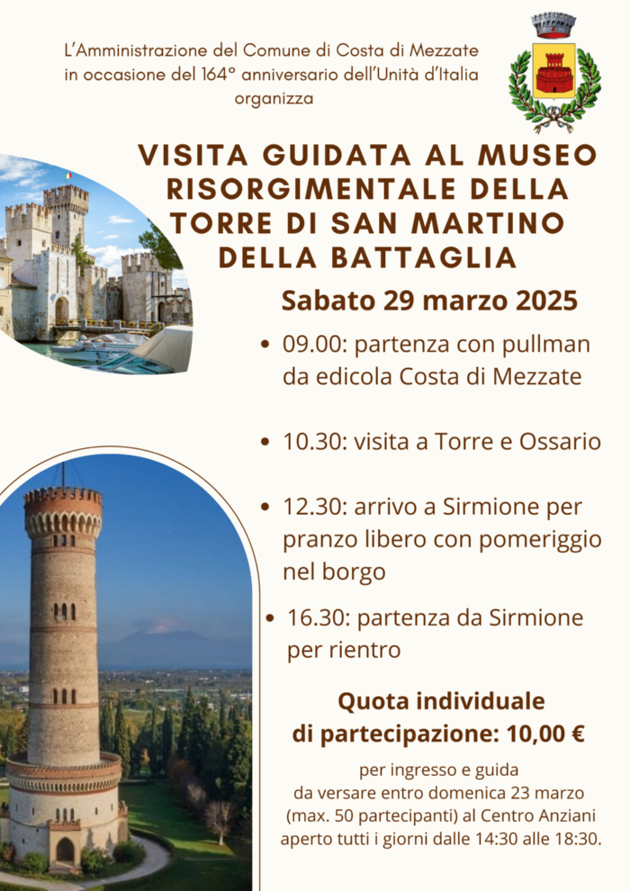 In occasione del 164° anniversario dell’Unità d’Italia, l'Amministrazione comunale di Costa di Mezzate organizza la visita guidata al museo risorgimentale di San Martino della battaglia.