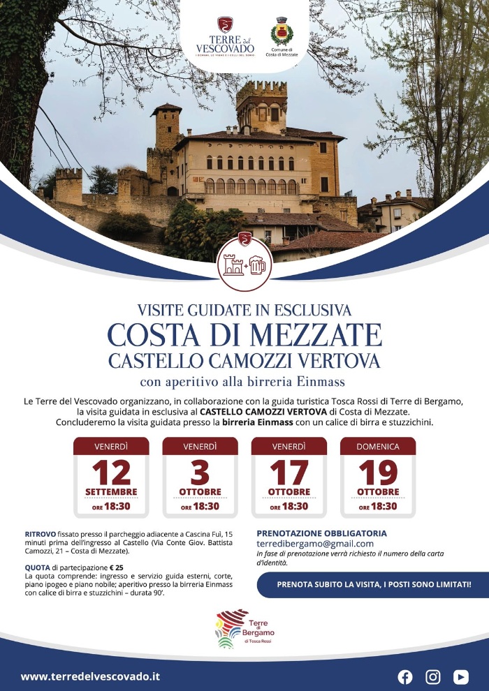 Terre del Vescovado, in collaborazione con Tosca Rossi di Terre di Bergamo, organizza la visita guidata in esclusiva al Castello Camozzi Vertova di Costa di Mezzate, con degustazione finale presso la birreria del centro storico, situata al piano terra della Torre degli Zoppi.