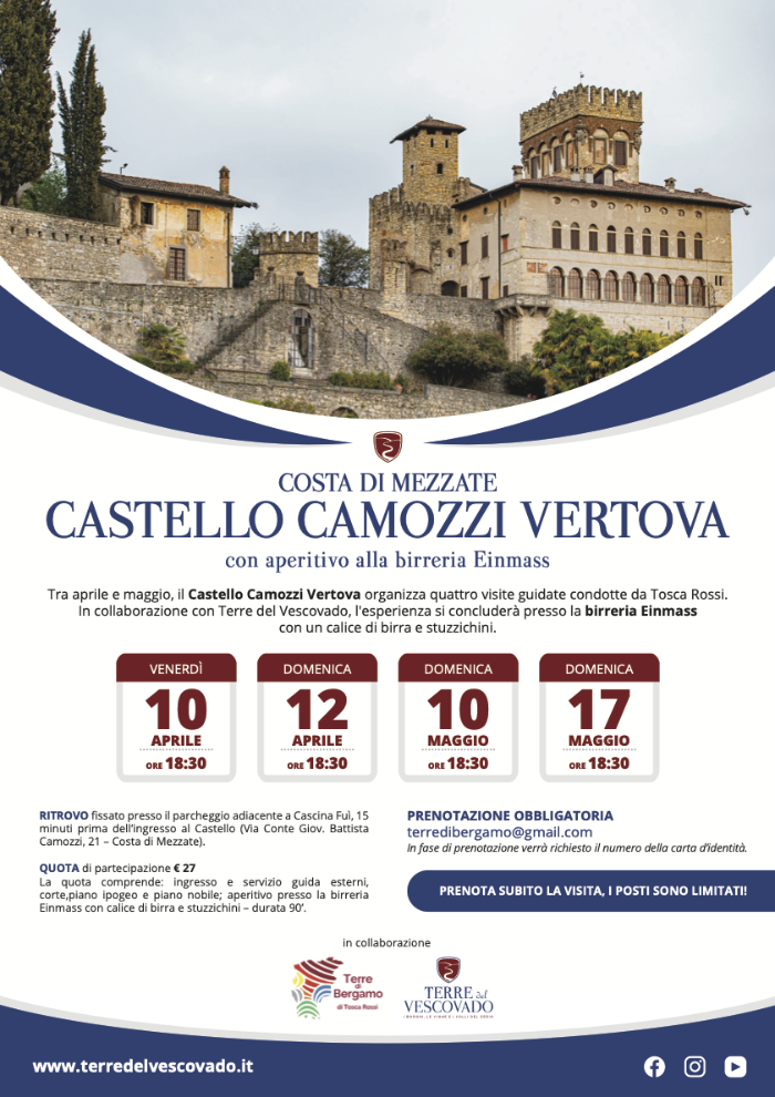 Terre del Vescovado, in collaborazione con Tosca Rossi di Terre di Bergamo, organizza la visita guidata in esclusiva al Castello Camozzi Vertova di Costa di Mezzate, con degustazione finale presso la birreria Einmass del centro storico, situata al piano terra della Torre degli Zoppi.